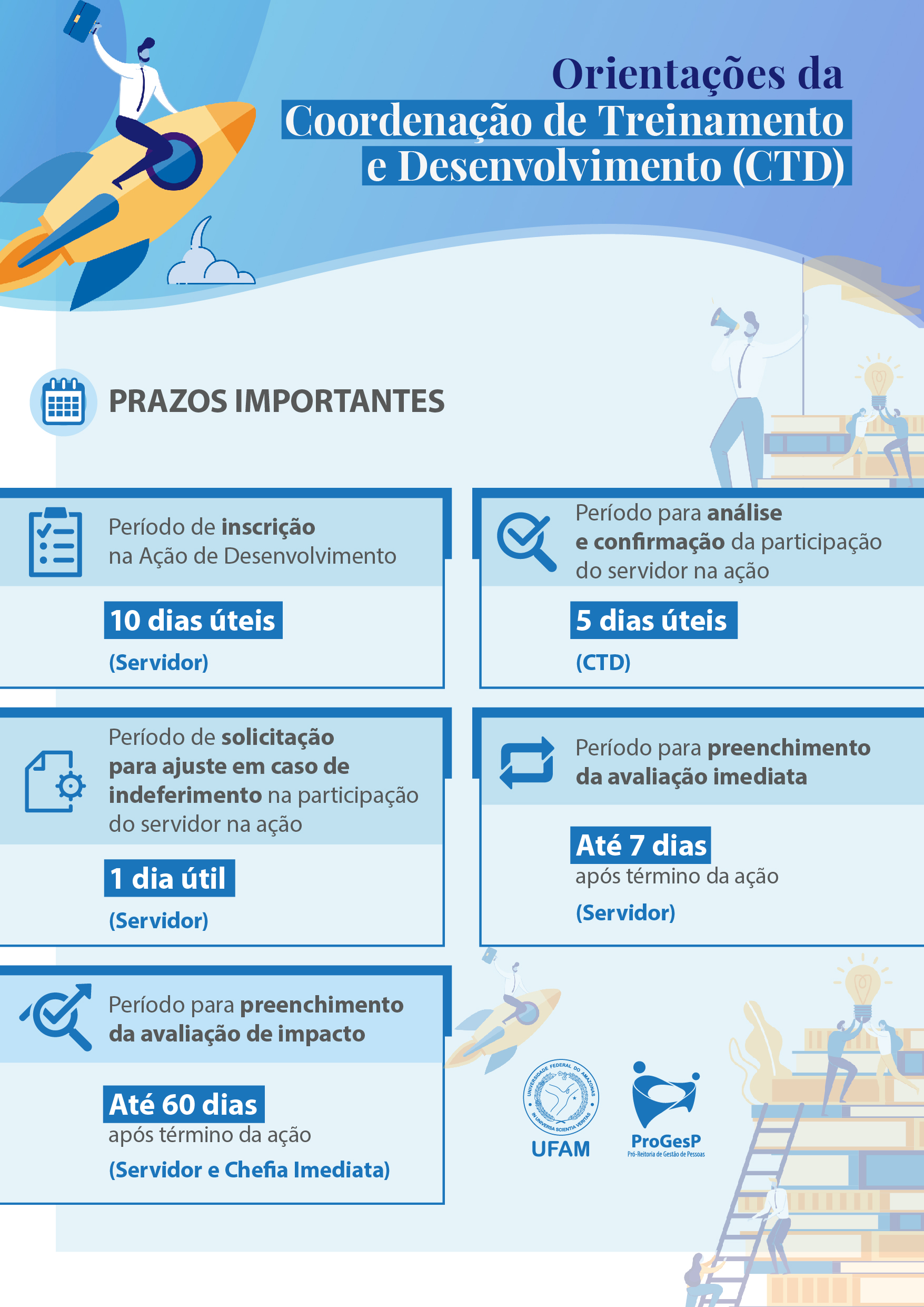 O Departamento de Desenvolvimento de Pessoas da ProGesP, visando facilitar e aprimorar os processos internos, divulga algumas das principais orientações relacionadas à participação dos servidores em Ações de Desenvolvimento Interna.