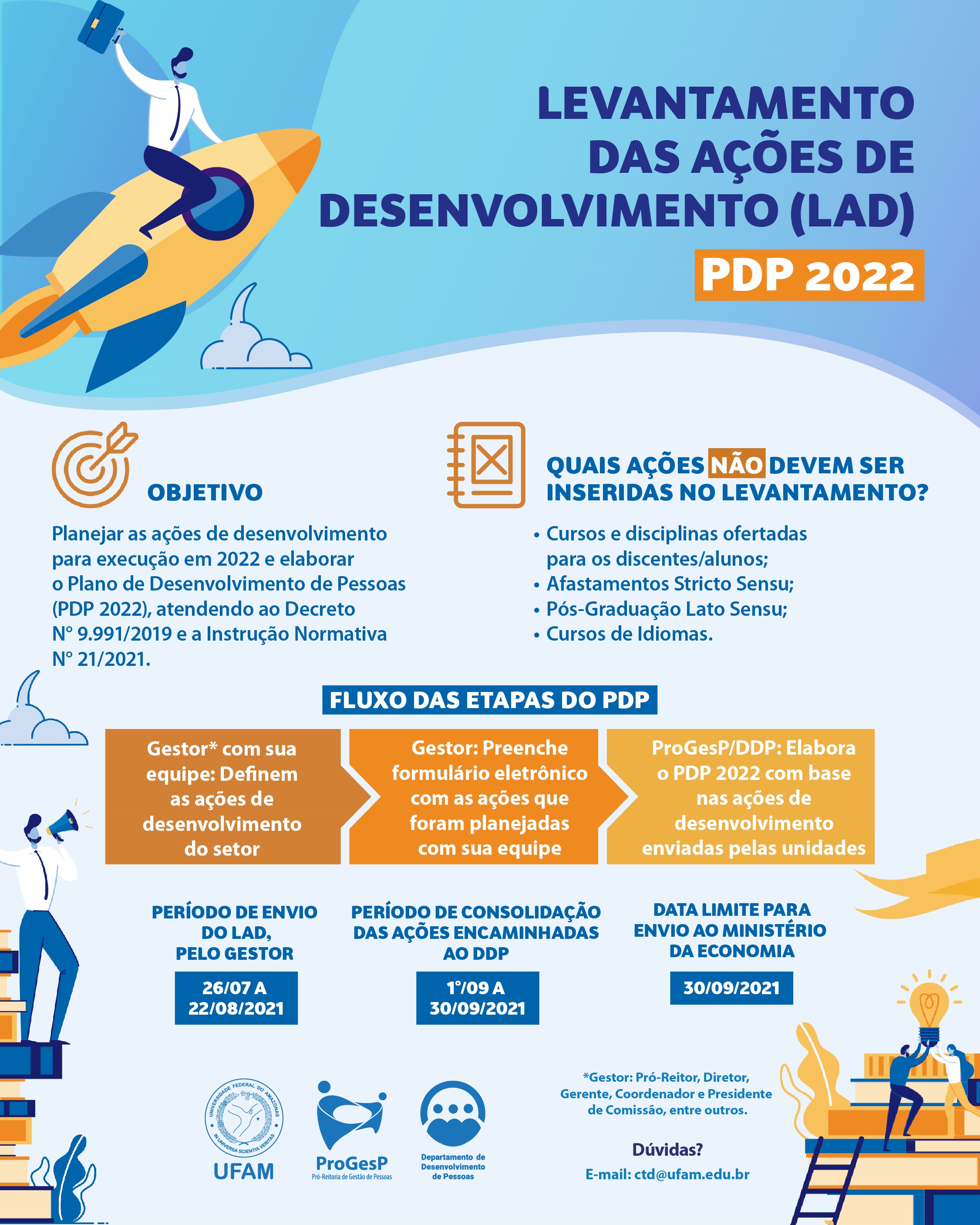 O LAD tem como objetivo planejar as ações de desenvolvimento para execução em 2022 e elaborar o Plano de Desenvolvimento de Pessoas (PDP 2022), atendendo ao Decreto N° 9.991/2019 e a Instrução Normativa N° 21/2021.
