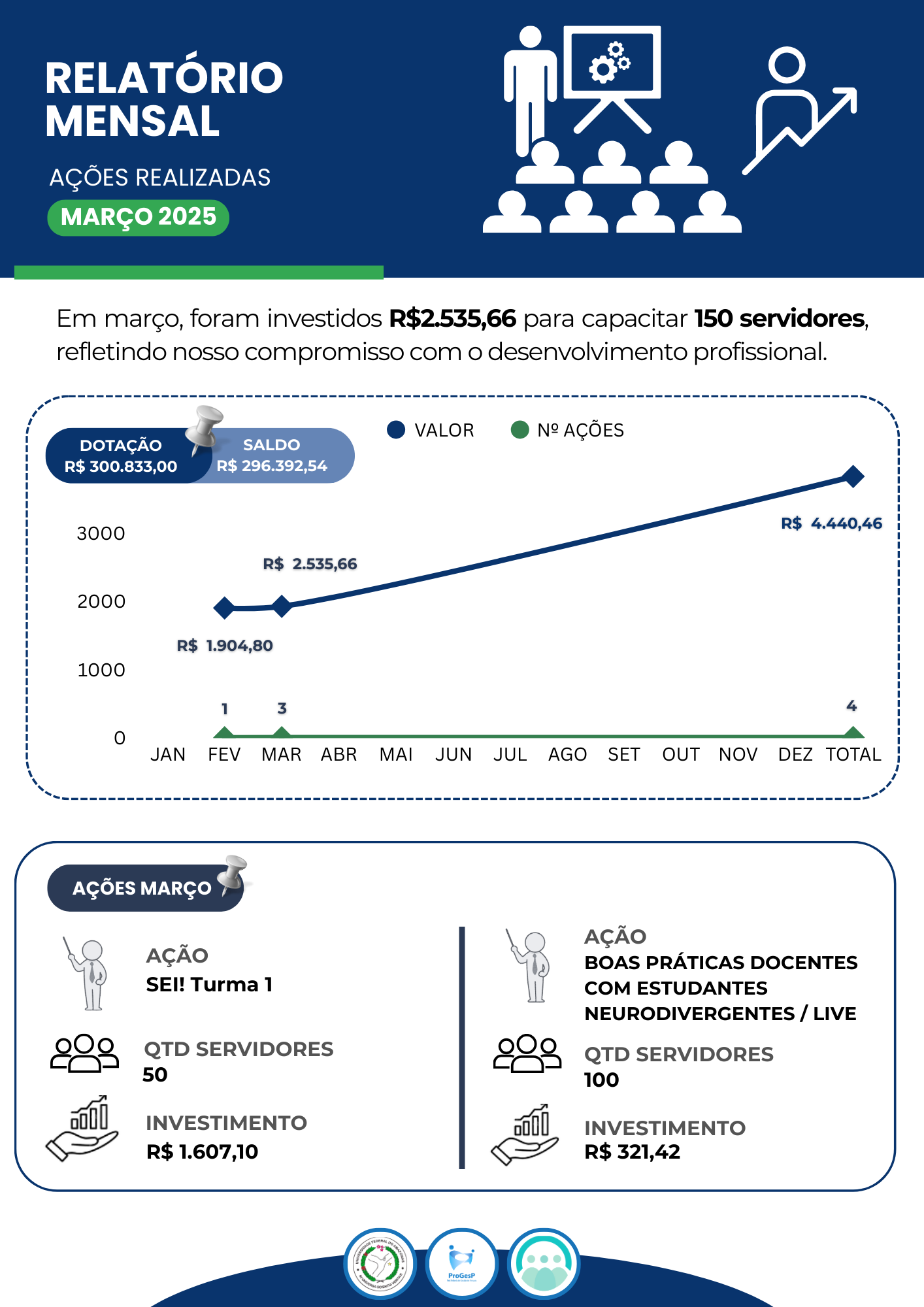 O Departamento de Desenvolvimento de Pessoas da PROGESP divulga o Relatório Mensal das Ações, com os valores investidos e a quantidade de servidores capacitados no mês de Março.