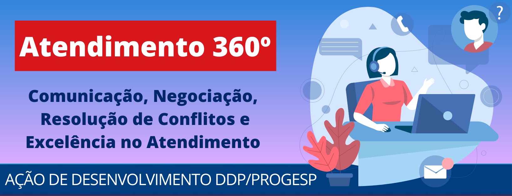 O Departamento de Desenvolvimento de Pessoas da PROGESP divulga a ação de desenvolvimento Atendimento 360º em parceria com a Consultre. Objetivo: Aprimorar habilidades de comunicação, atendimento de qualidade para garantir a satisfação do público da UFAM. Período: 31/07 a 07/08/2023 Modalidade: On-Line (Plataforma Zoom) Carga Horária: 20 horas