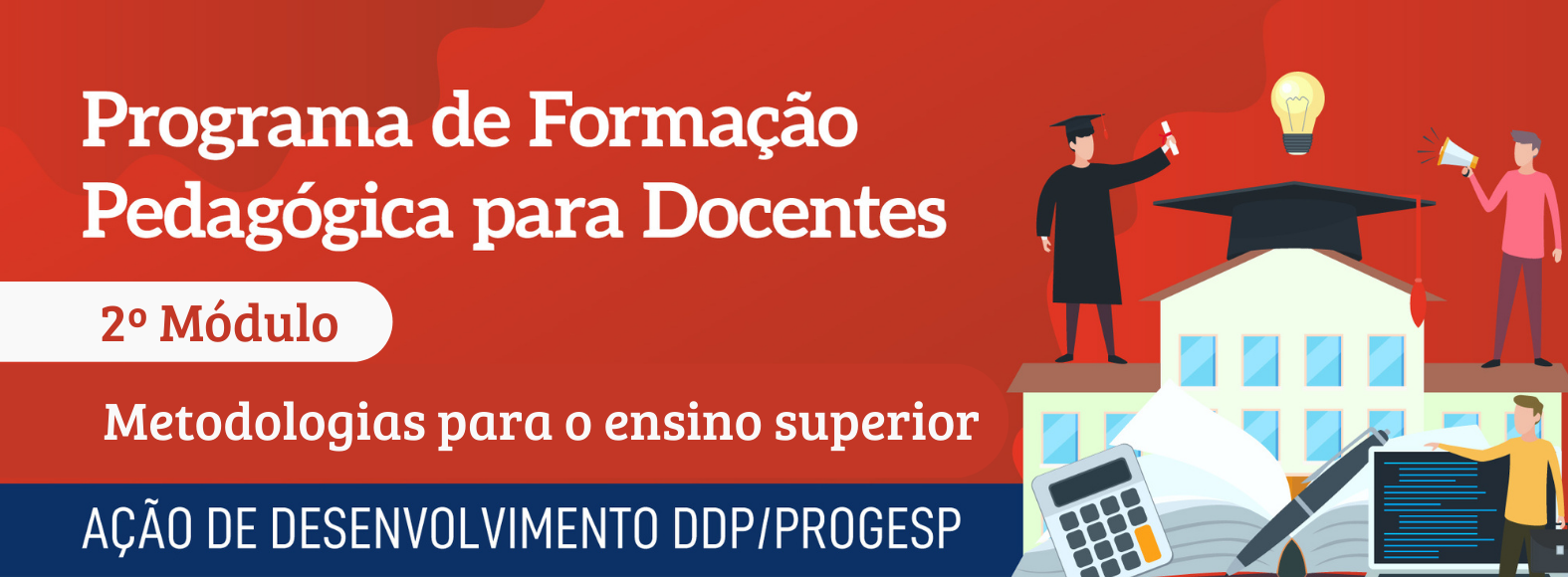 O Departamento de Desenvolvimento de Pessoas da PROGESP divulga turma do ano de 2023 do Programa de Formação Pedagógica para Docentes – 2° Módulo: Metodologias para o Ensino Superior Objetivo: Promover a diversificação das aulas, utilizando metodologias adequadas aos objetivos de ensino-aprendizagem. Período do curso: 31/07/23 a 11/08/23 Público-Alvo: Docentes da Ufam Relatório Final: https://bit.ly/RelatórioFinalMetodologias23 |