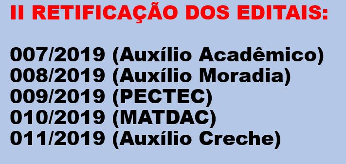 A Pró-Reitoria de Gestão de Pessoas – PROGESP, por meio do Departamento de Assistência Estudantil – DAEST, no uso de suas atribuições, torna pública a 1ª Retificação...