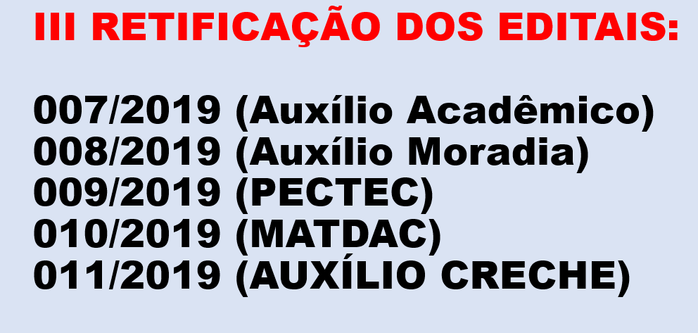 A Pró-Reitoria de Gestão de Pessoas – PROGESP, por meio do Departamento de Assistência Estudantil – DAEST, no uso de suas atribuições, torna pública a 3ª...
