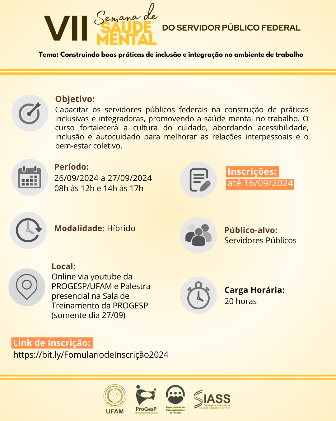 O Departamento de Desenvolvimento de Pessoas da PROGESP, em parceria com o SIASS, divulga a VII Semana de Saúde Mental do Servidor Público Federal, com o tema "Construindo boas práticas de inclusão e integração no ambiente de trabalho".