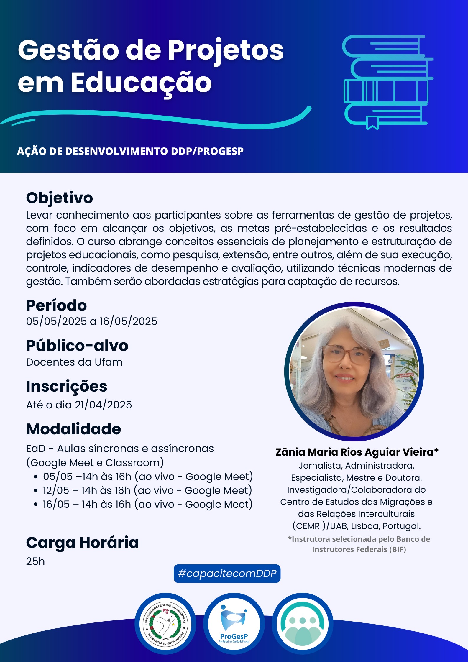A instrutora desta ação, Zânia Maria Rios Aguiar Vieira, é administradora e jornalista, doutora em Relações Interculturais (UAb-Portugal) e pesquisadora do  Centro de Estudos das Migrações e das Relações Interculturais (CEMRI). Atua na UFRN com Educação a Distância e possui experiência em gestão de projetos, com capacitações nacionais e internacionais, além de atuação docente na área. Foi selecionada para esta ação pelo Banco de Instrutores Federais (BIF) - DDP/UFAM.