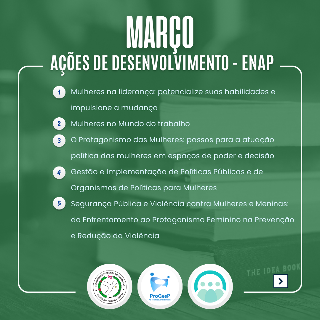 Departamento de Desenvolvimento de Pessoas da PROGESP indica ações de desenvolvimento para o mês de Março ofertadas pela ENAP e solicitadas no Plano de Desenvolvimento de Pessoas - PDP UFAM 2025.