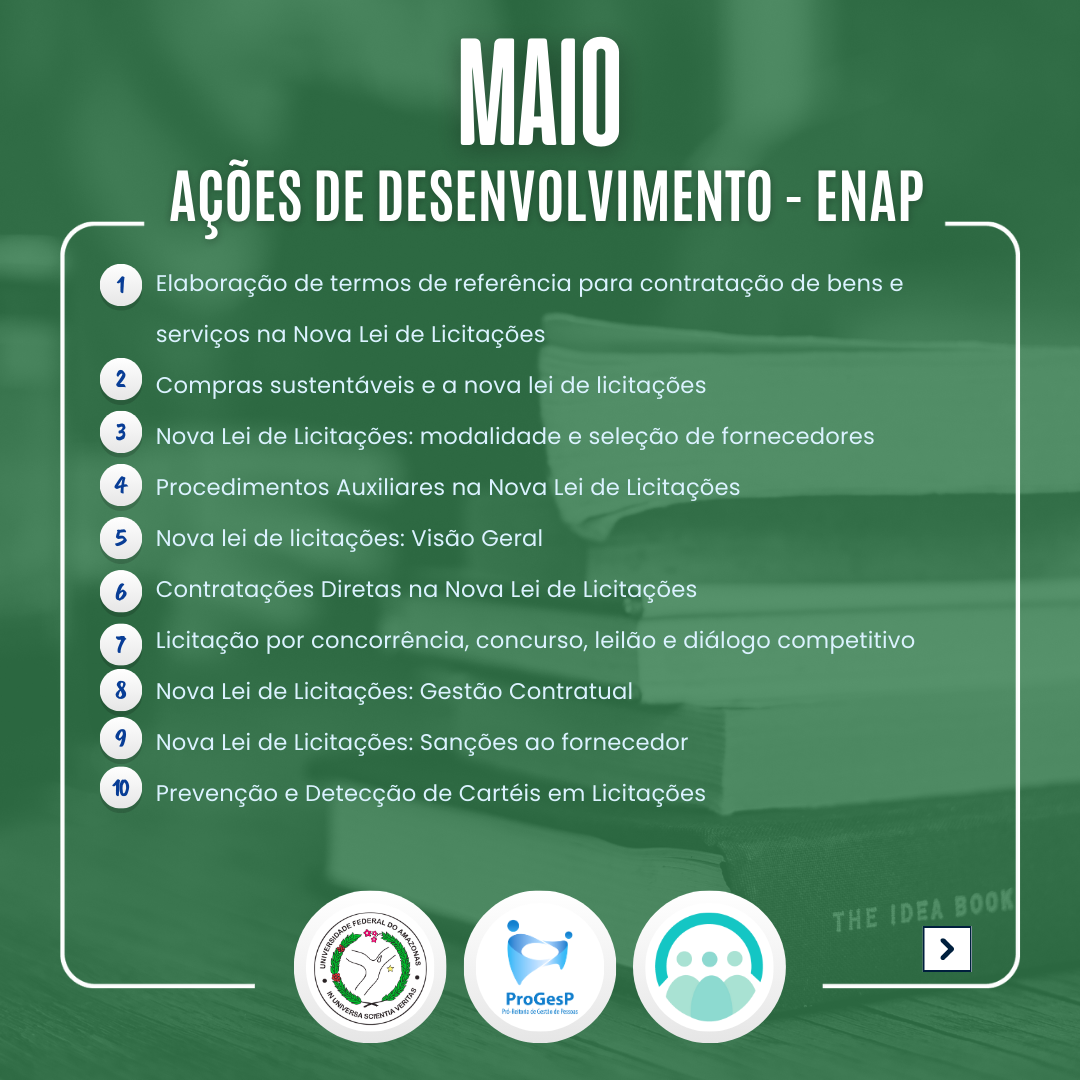 O Departamento de Desenvolvimento de Pessoas da PROGESP indica ações de desenvolvimento para o mês de Maio ofertadas pela ENAP e solicitadas no Plano de Desenvolvimento de Pessoas - PDP UFAM 2025.