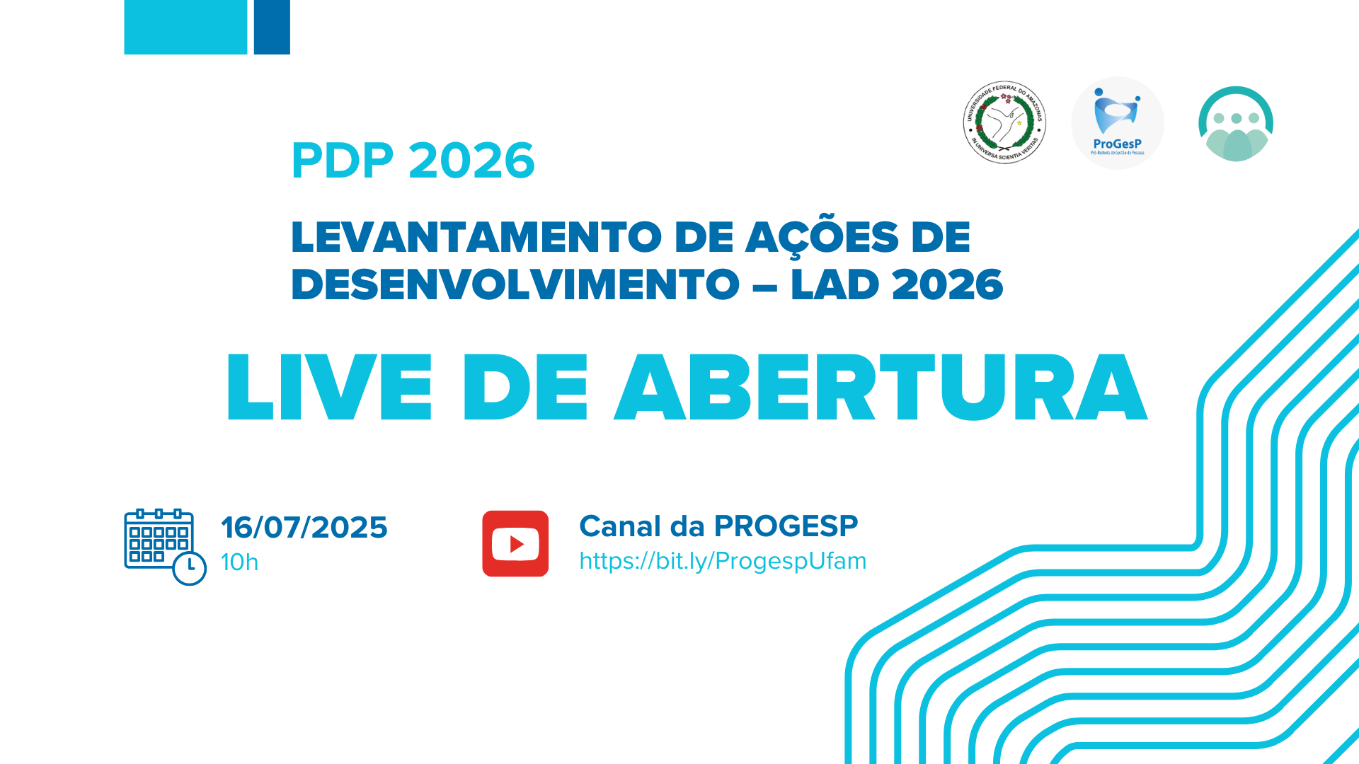 A PROGESP, por meio do Departamento de Desenvolvimento de Pessoas (DDP) e Coordenação de Treinamento e Desenvolvimento (CTD), convida todos os(as) servidores(as) a participarem da Live de lançamento do LAD 2026, etapa essencial para a construção do Plano de Desenvolvimento de Pessoas da UFAM.