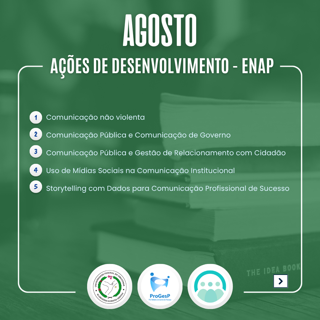O Departamento de Desenvolvimento de Pessoas da PROGESP indica ações de desenvolvimento para o mês de Agosto ofertadas pela ENAP e solicitadas no Plano de Desenvolvimento de Pessoas - PDP UFAM 2025.