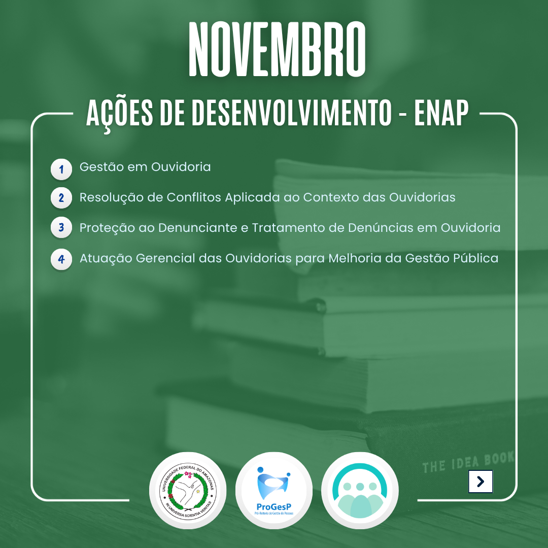 O Departamento de Desenvolvimento de Pessoas da PROGESP indica ações de desenvolvimento para o mês de Novembro ofertadas pela ENAP e solicitadas no Plano de Desenvolvimento de Pessoas - PDP UFAM 2025.