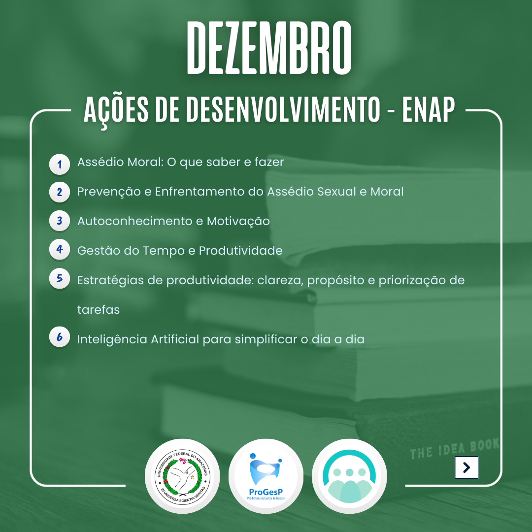 O Departamento de Desenvolvimento de Pessoas da PROGESP indica ações de desenvolvimento para o mês de Dezembro ofertadas pela ENAP e solicitadas no Plano de Desenvolvimento de Pessoas - PDP UFAM 2025.